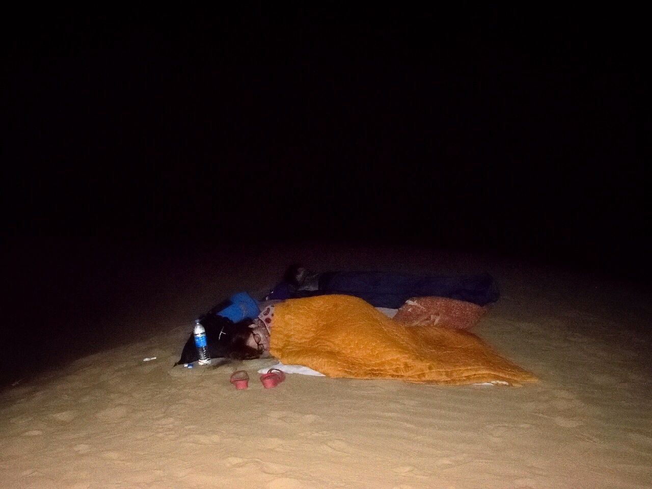 満点の星空の元、布団を敷いて砂漠で就寝。