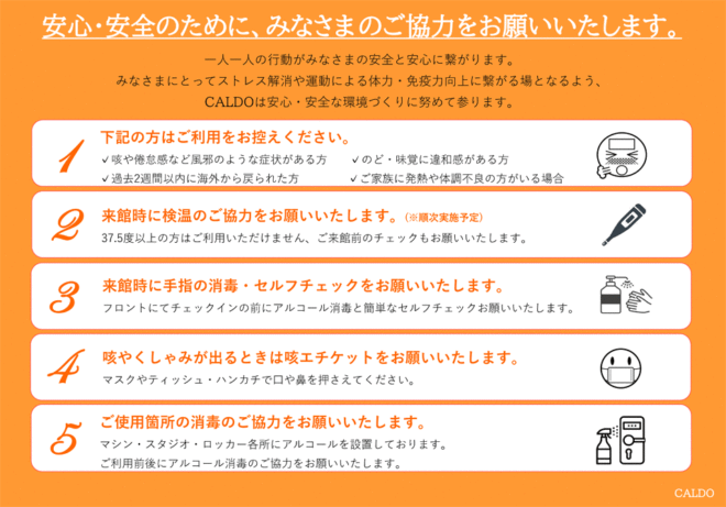 また会員の皆様におかれましては、ご自身の健康管理にご留意いただくとともに、咳(せき)発熱等の症状が見られた場合や体調がすぐれない場合は、スタジオのご利用をお控えいただきますようお願い申し上げますのと、ご来店時にはフロントにて体調確認をさせていただきますのであわせてご協力をお願い申し上げます。<施設安全対策>