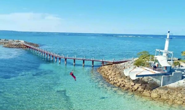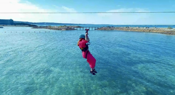 グラデーション・ブルーの海へと滑走する250メートルのジップライン。